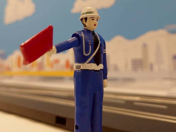 4. 片側交互通行の仕事体験(20分) 実際の道路を想定した模型とスロットカーを使用した本格的な体験: